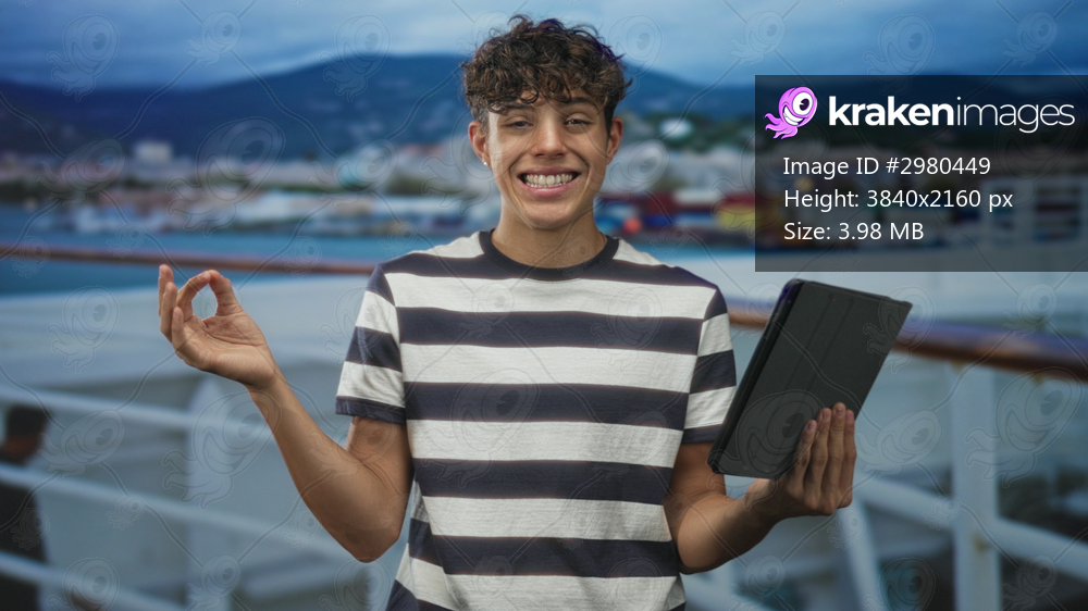 Teenager holding tablet and right hand forming ok gesture on ferry deck with harbor building in view; happiness learning.