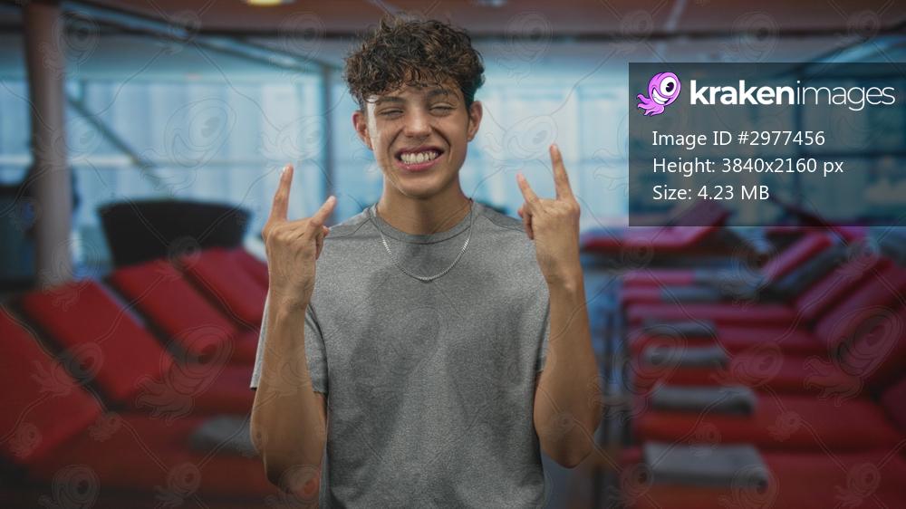 Teenager makes rock sign with hands in airport lounge with red recliners; youthful playful confidence.