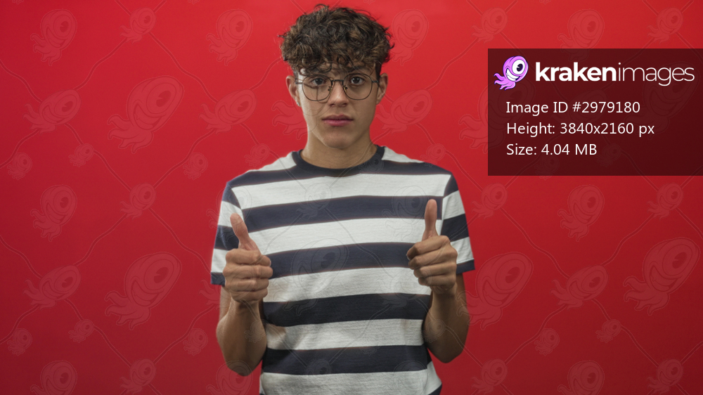 Teenager man with glasses in a striped shirt giving thumbs up and hands on hips in studio; confidence playful ease.