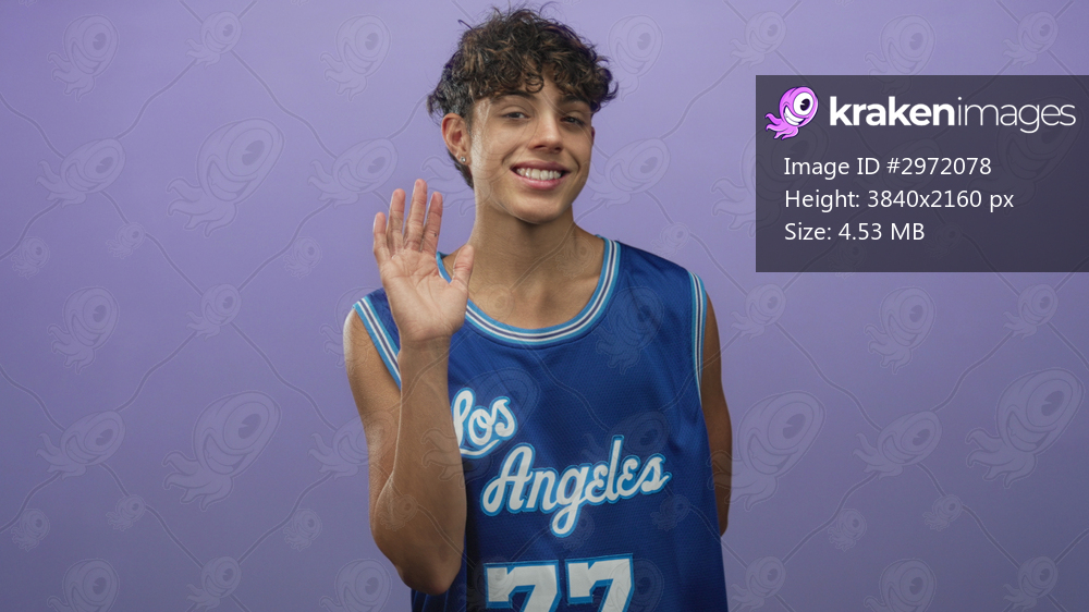 Teenager waves hand showing palm in studio wearing blue los angeles basketball jersey and smiling; friendly greeting.