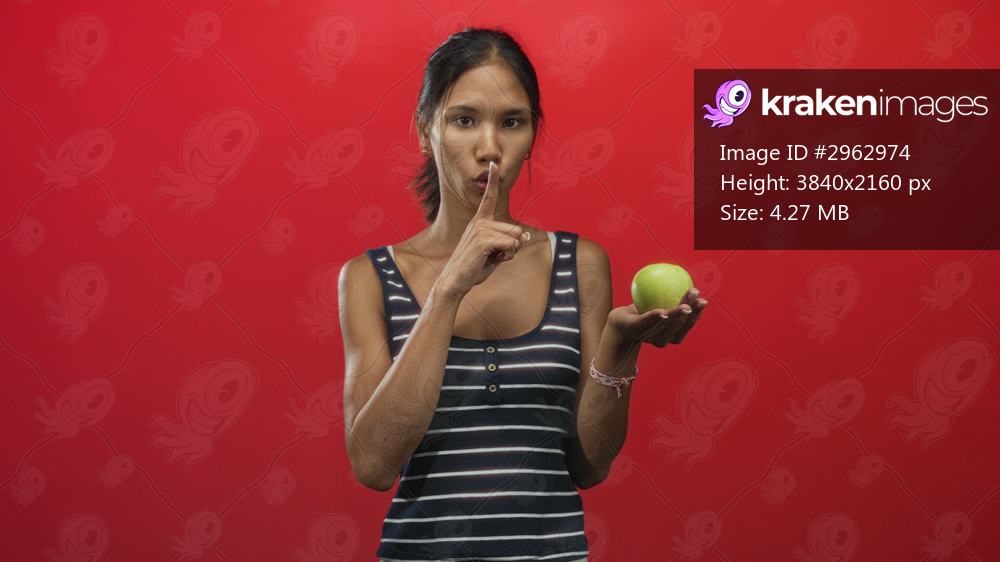 Thai brunette woman holds green apple and raises finger to lips for silence in a studio; secret silence.