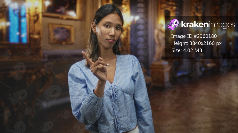 Thai brunette woman in blue blouse holds up two fingers while showing hand and looking sideways in ornate building with statues and chandeliers; contemplation. - Kraken Images
