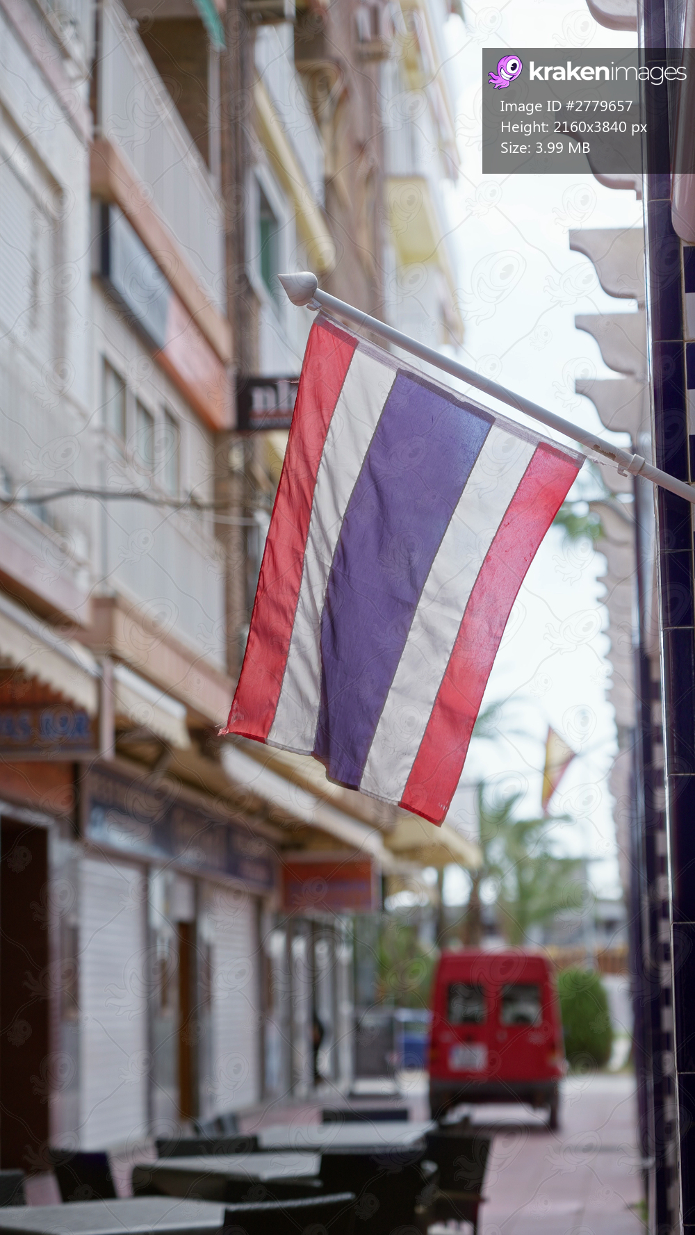 Thai flag waving outdoors on a sunny street with tables and chairs under closed store awnings, creating a vibrant and bustling atmosphere in urban thailand. - Kraken Images