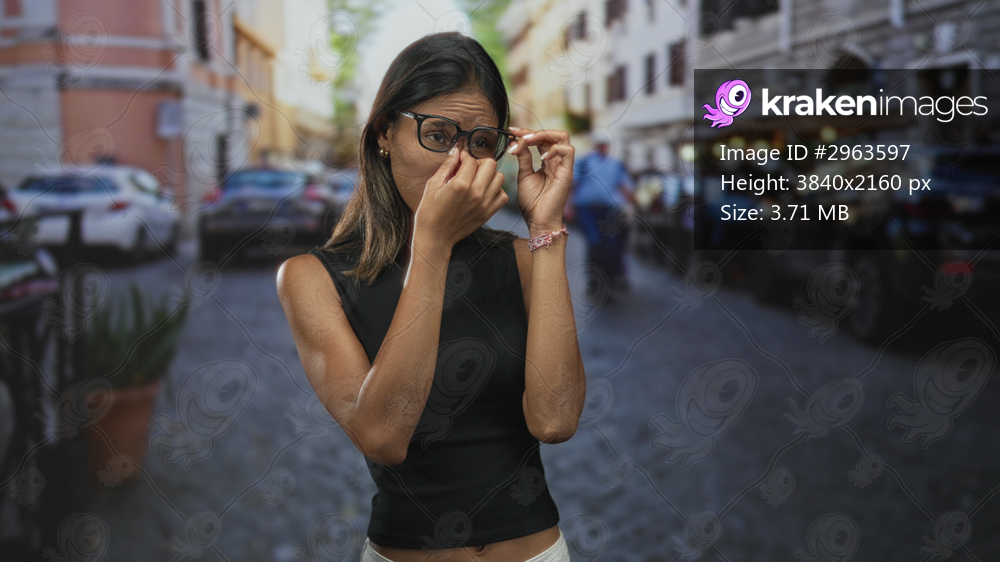 Thai woman adjusting glasses and pinching nose on a cobblestone street near parked cars and outdoor cafe; fatigue travel.