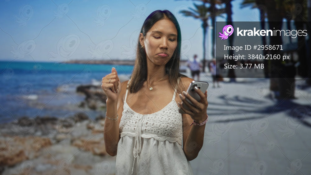 Thai woman brunette smiling, holding smartphone in right hand and raising left hand on a street promenade by the sea wearing white sundress; joy connection. - Kraken Images