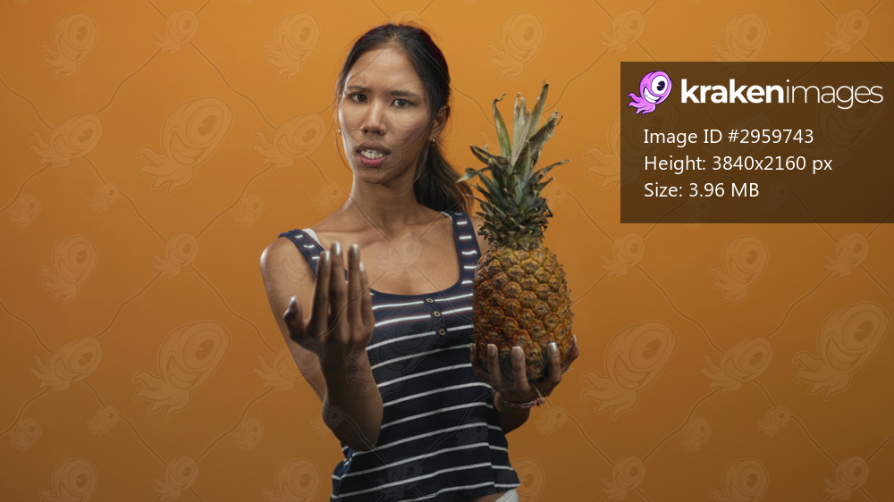 Thai woman brunette wearing navy striped tank holds a ripe pineapple in left hand and beckons with right palm forward on an orange studio set; skepticism. - Kraken Images