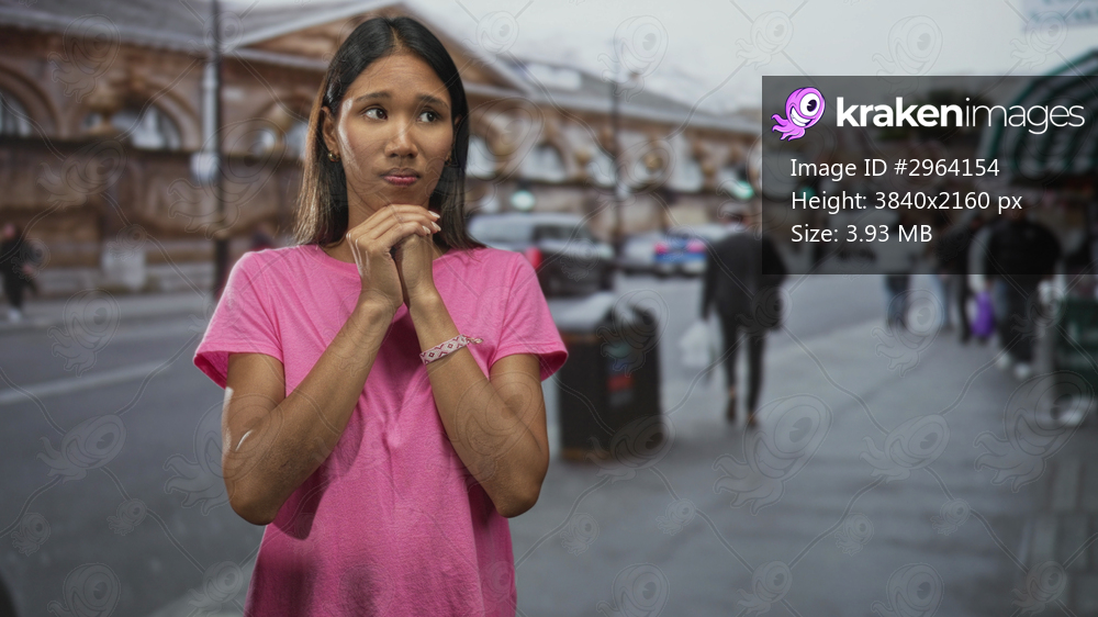 Thai woman clasping hands in a pleading prayer gesture on a busy street near a station, wearing a pink t shirt; quiet hopeful plea.