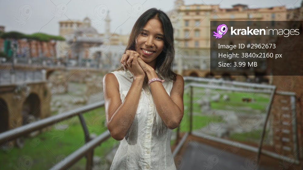 Thai woman clasping hands near face, smiling on building balcony overlooking ancient ruins and stone arches; serenity gratitude.