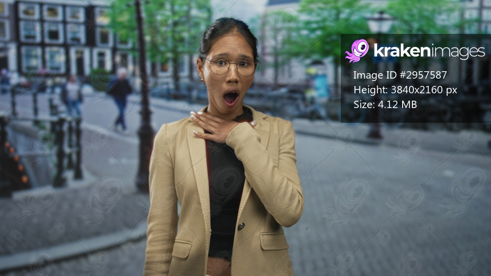 Thai woman clutching her throat with hand, mouth open gasping on a street with bicycles and lampposts; panic concern.