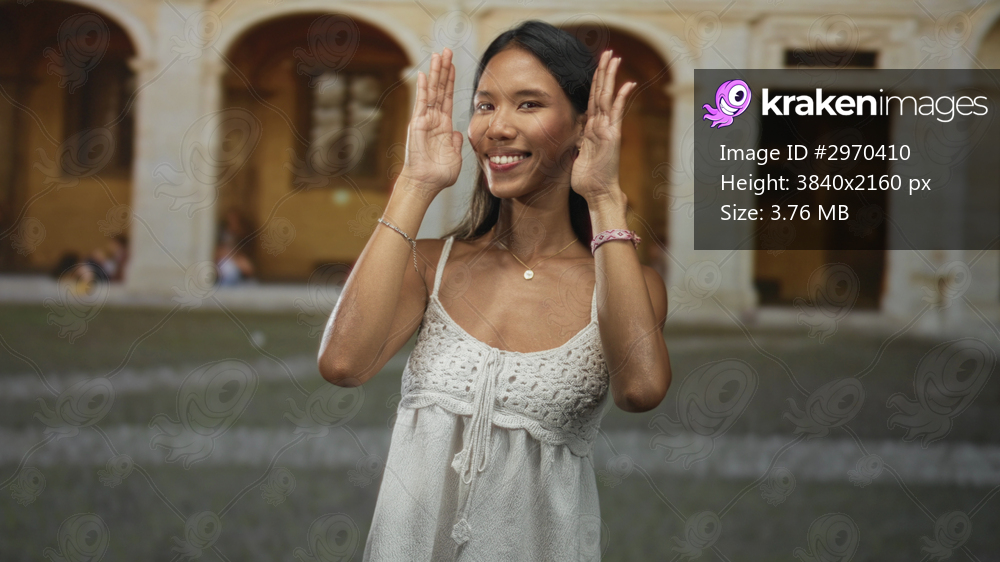 Thai woman covers face with hands in building courtyard, wearing white sundress, bracelet and necklace; playful joy.