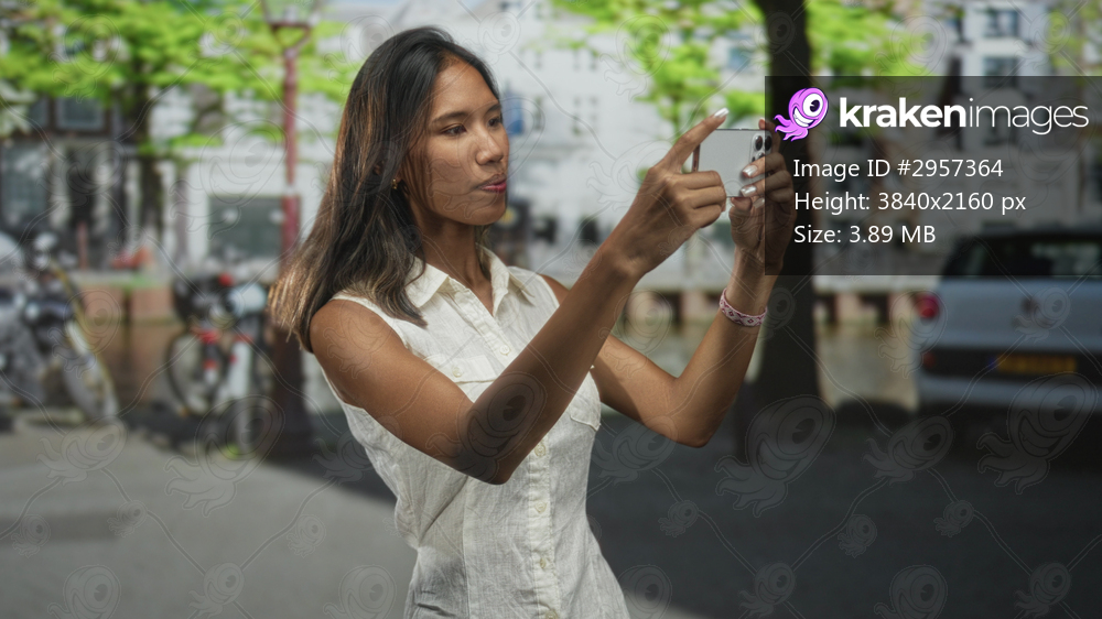 Thai woman covers mouth with hand while holding smartphone selfie on street beside canal and parked car; joyful surprise.