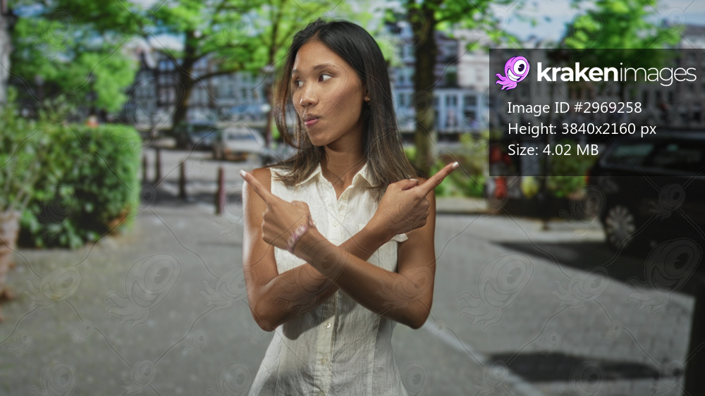 Thai woman with crossed arms and pointing fingers, eyes closed with pursed lips, standing on a city street by parked cars and trees; uncertainty.