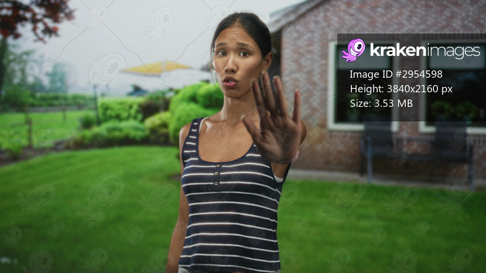 Thai woman extends hand palm forward in a stop gesture outside a brick building on a green lawn with windows and umbrella; refusal boundary.