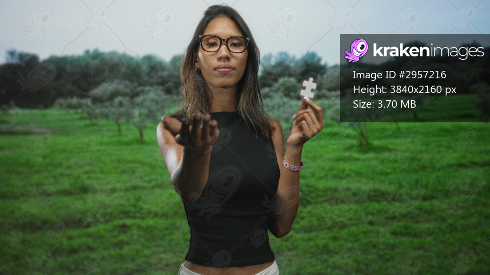 Thai woman extends her hand while holding a white puzzle piece, offering it forward in a green meadow with scattered trees; connection contemplation.