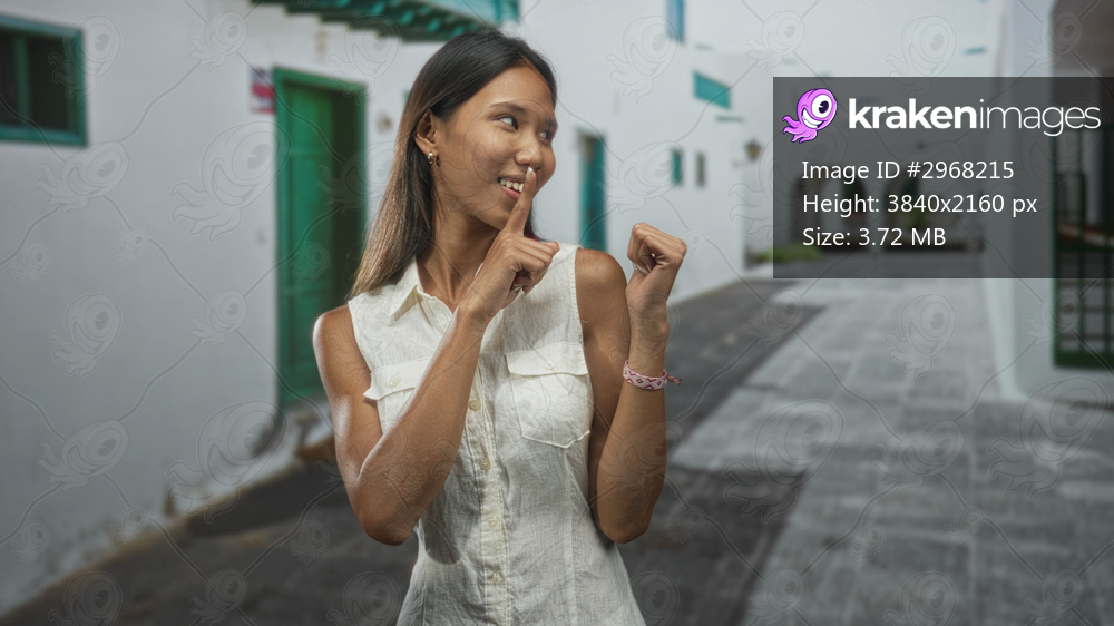 Thai woman with finger to lips gesture wearing sleeveless shirt on a white street with green doors and arches; playful secrecy.