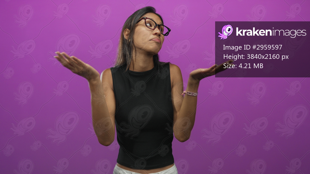 Thai woman with glasses and bare forearms plugging her ears with fingers and shrugging in studio amid purple backdrop; annoyance boundaries.