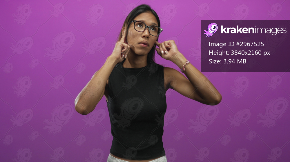 Thai woman with glasses and bare forearms plugging her ears with fingers and shrugging in studio amid purple backdrop; annoyance boundaries.