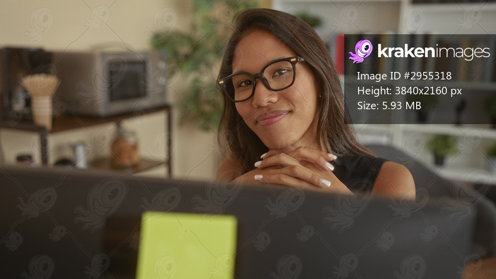 Thai woman with glasses and hands clasped under chin at studio desk with computer monitor and bookshelf visible; thoughtful focus.