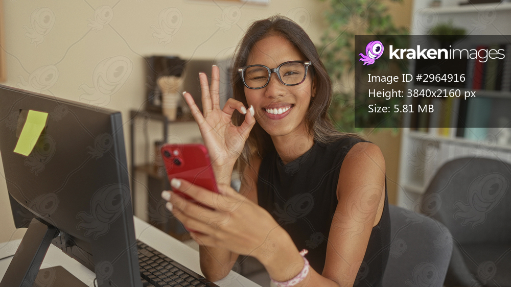 Thai woman with glasses holding red smartphone and making ok sign while seated at desk with monitor and keyboard in office building; remote work joy.