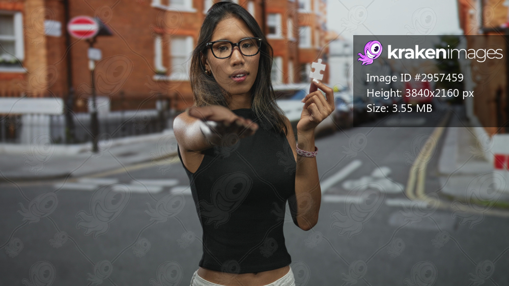 Thai woman with glasses holds a white puzzle piece in her right hand and extends left palm toward camera on a street; connection curious.