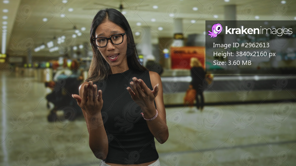 Thai woman with glasses holds empty palms at airport baggage carousel, looking down at her hands and checking for lost luggage while gesturing to show nothing; concern. - Kraken Images