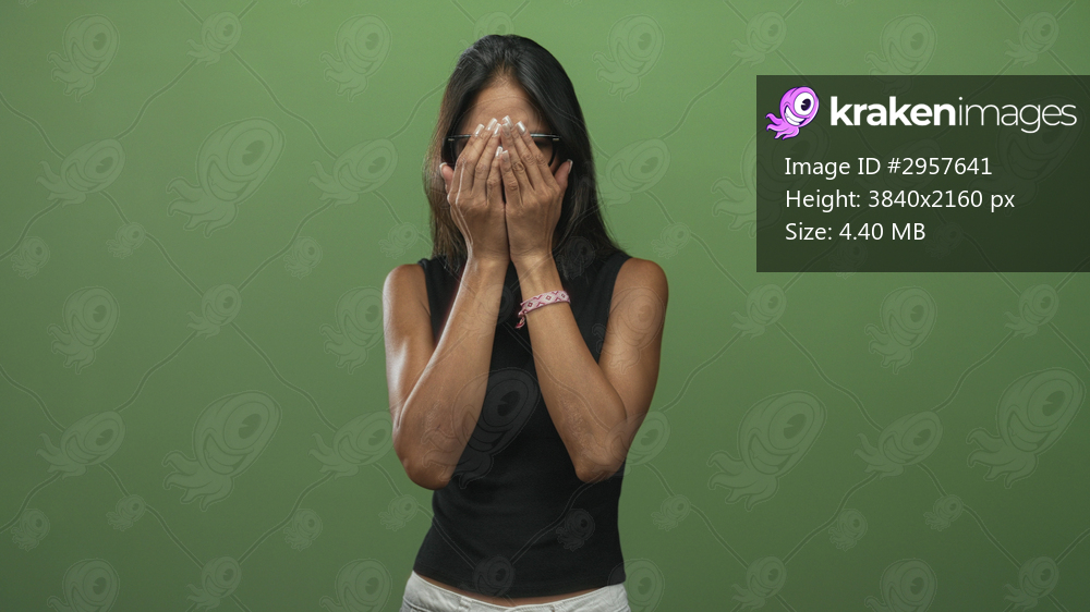 Thai woman with glasses pressing hands to mouth in studio green screen, bare forearms visible and black sleeveless tanktop; anxiety vulnerability.