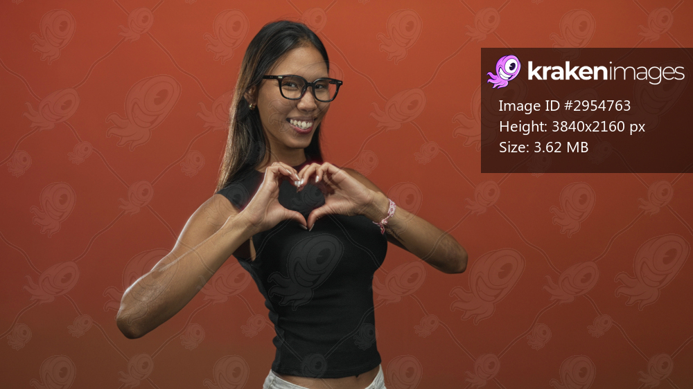 Thai woman with glasses and sleeveless black top makes a heart shape with hands and smiles toward camera in studio; affection warmth.
