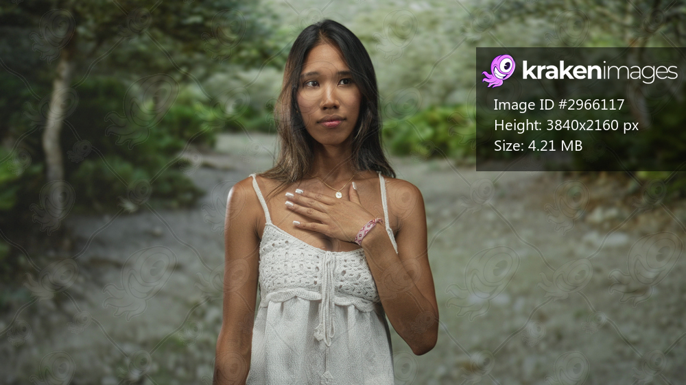 Thai woman with hand on chest and closed eyes wearing white summer dress in a forest; serenity gratitude reflection.