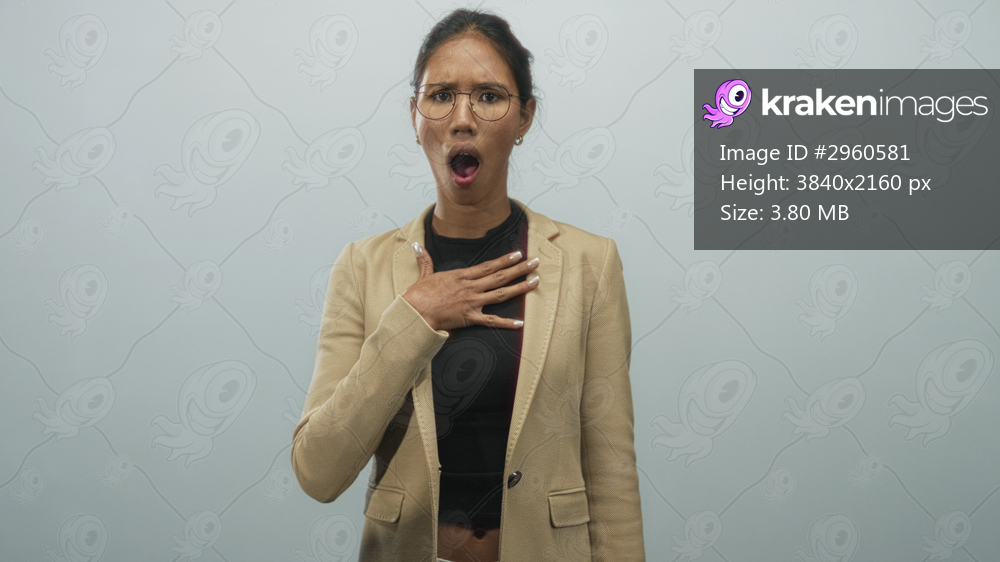 Thai woman hand on chest with open mouth and glasses wearing beige blazer in studio; surprise concern.