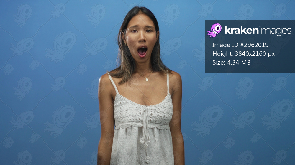 Thai woman with hands covering mouth and eyes closed, wearing a white dress against blue backdrop in studio; surprise vulnerability.