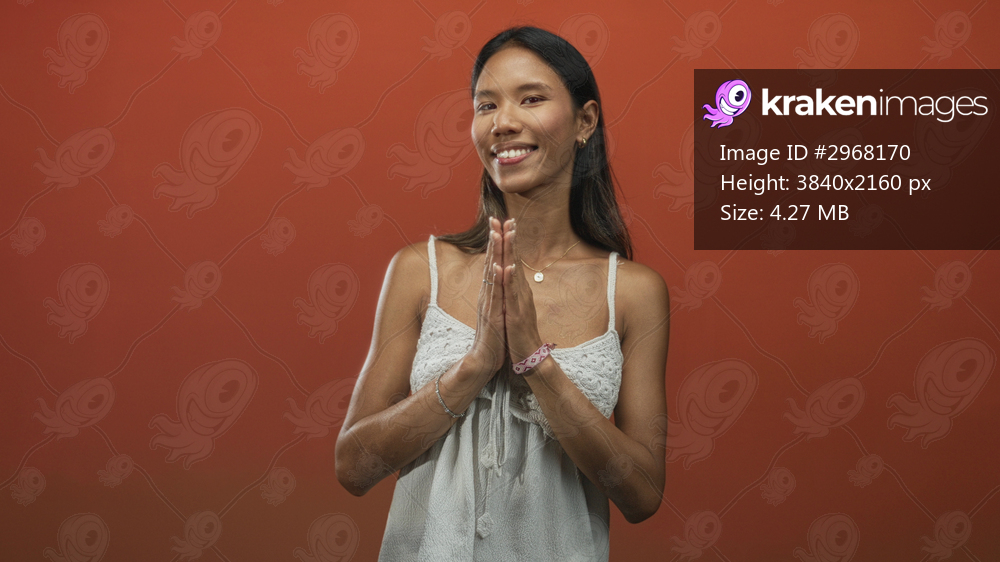 Thai woman with hands pressed together in a prayer gesture and smiling in a studio; gratitude mindfulness.