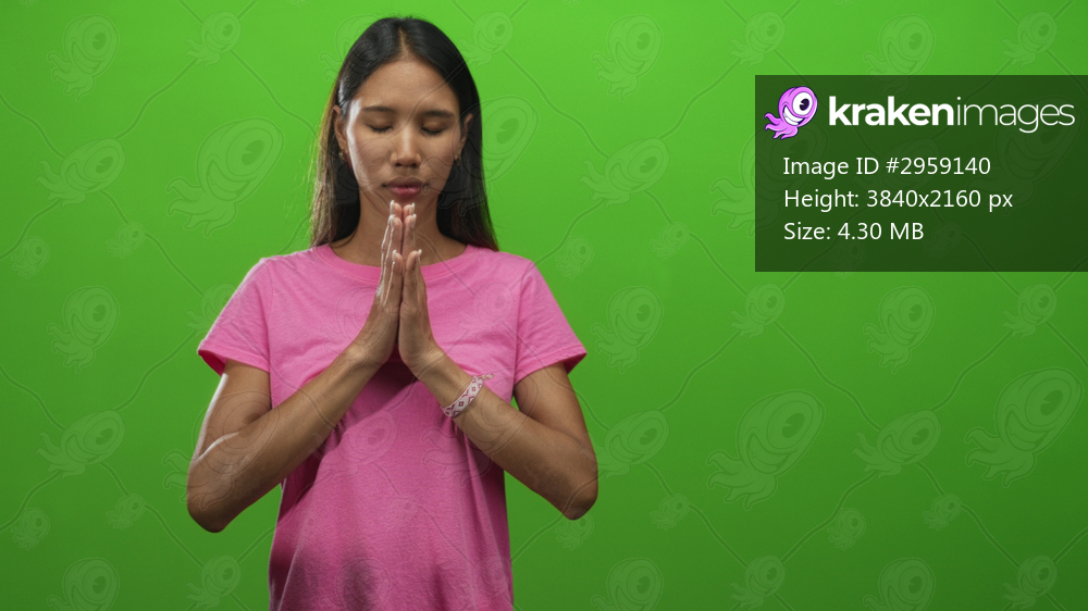 Thai woman with hands pressed together in prayer gesture wearing pink shirt and bracelet against studio green screen; serenity reflection.