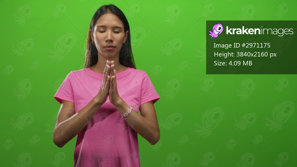 Thai woman with hands pressed together in prayer gesture wearing pink shirt and bracelet against studio green screen; serenity reflection.