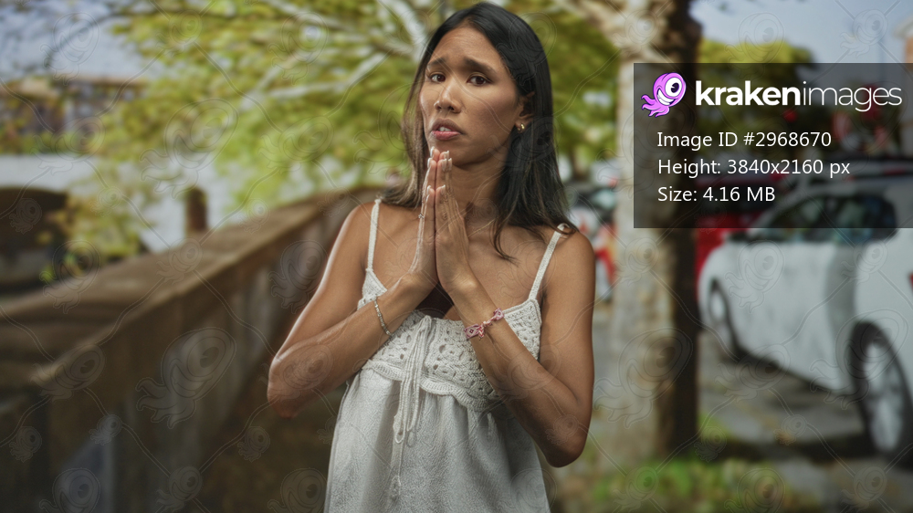Thai woman with hands pressed together in prayer gesture wearing white dress on a line of parked cars on a street by a riverside wall; pleading hope.