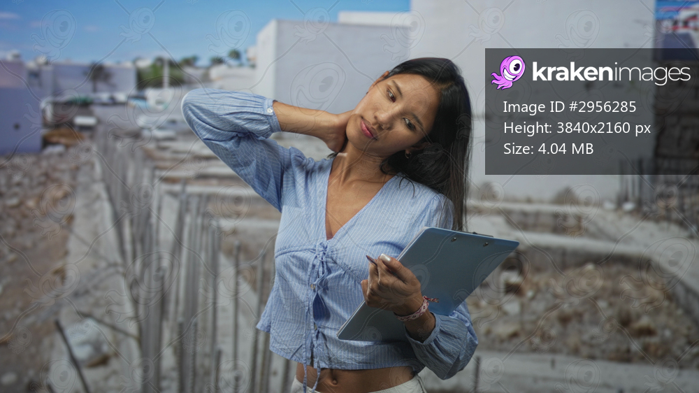 Thai woman holding a clipboard and reading notes while touching her neck at a building construction site under sunlight; concern work stress.