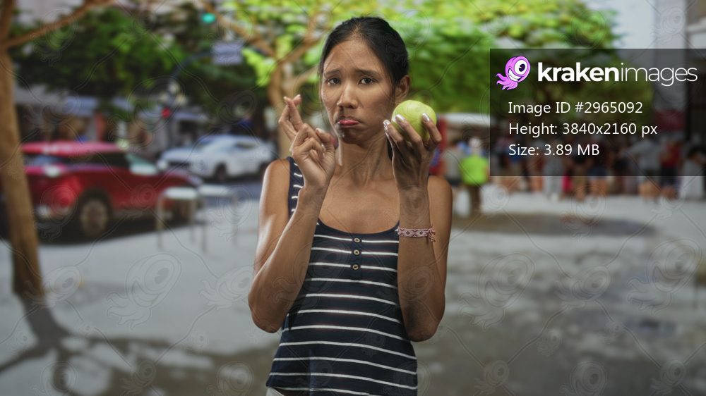 Thai woman holding a green apple with fingers crossed near her nose, inspecting and smelling the fruit while standing on a street; hesitation evaluation. - Kraken Images