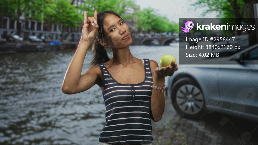 Thai woman holding a green apple in one hand and making an ok gesture with the other on a canal street by parked cars and bridge; playful confidence.