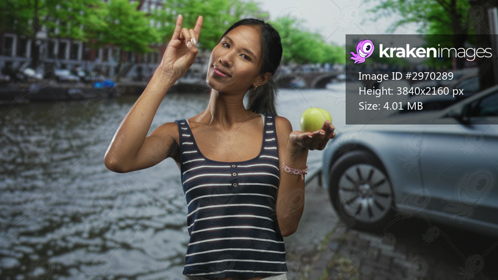 Thai woman holding a green apple in one hand and making an ok gesture with the other on a canal street by parked cars and bridge; playful confidence.