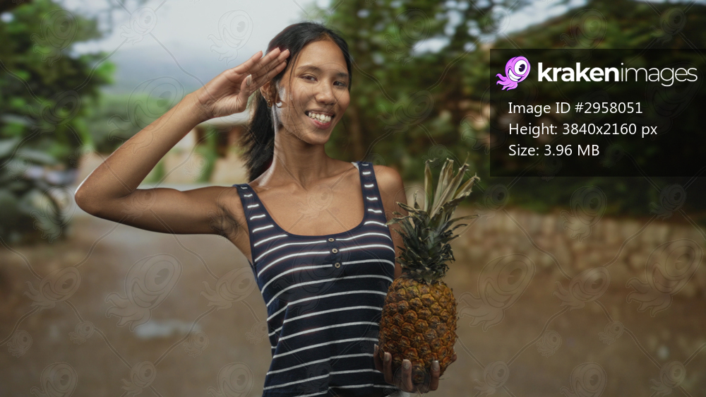Thai woman holding a pineapple with one hand and saluting with raised right hand on a village street beside a stone wall; welcome joy.