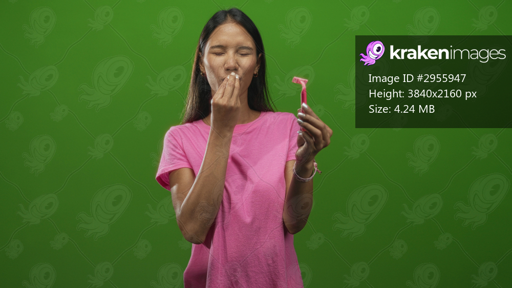 Thai woman holding a pink disposable razor, pinching her nose with fingers and smiling toward camera in studio; playful amusement.