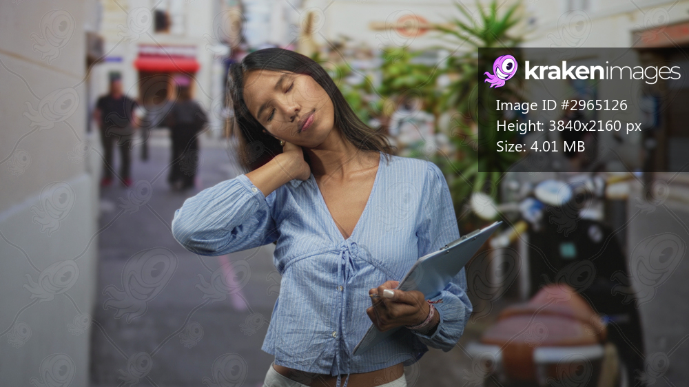 Thai woman holding clipboard with eyes closed touching neck on a narrow urban street; quiet serenity.