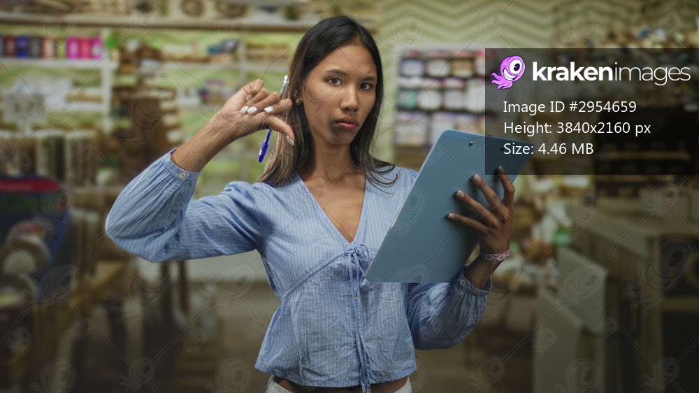 Thai woman holding clipboard and pen, making thumbs down gesture while inspecting shelves in a craft store building; disapproval inventory check.