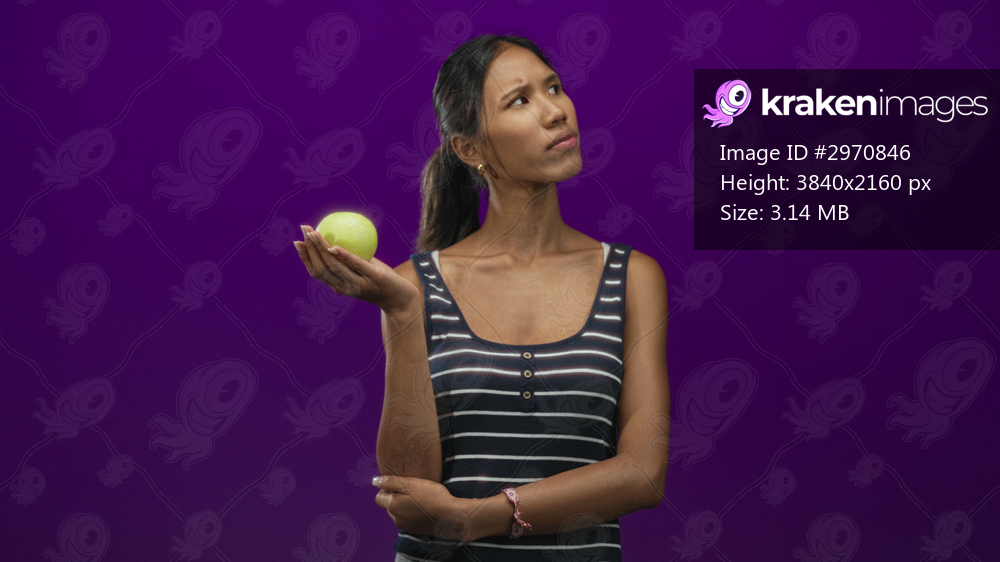 Thai woman holding green apple on open palm, smiling and gazing sideways while wearing a striped tank top in studio; contentment.