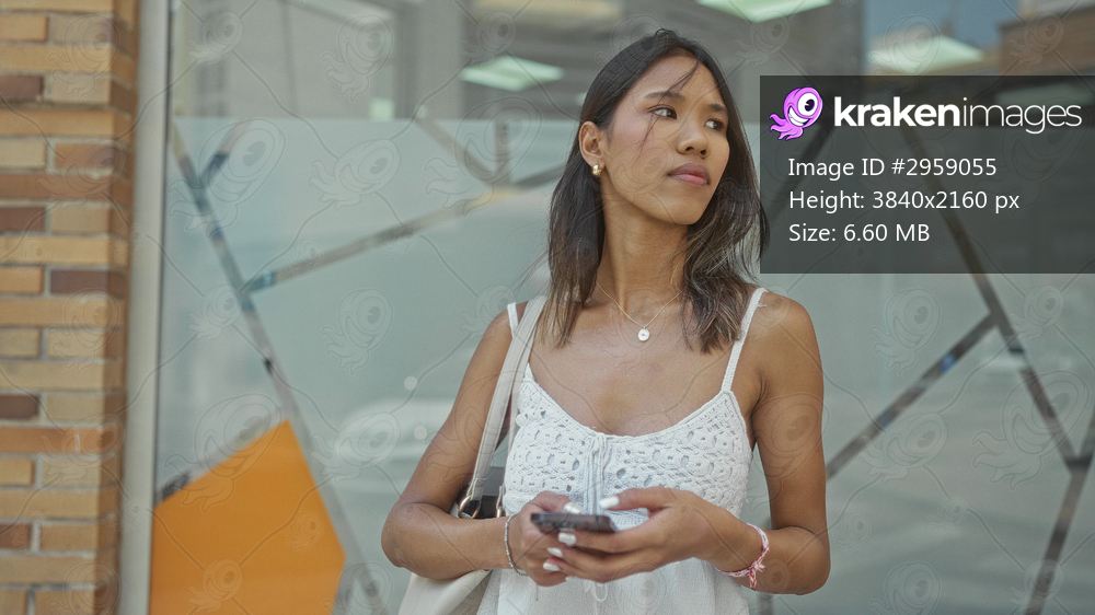 Thai woman holding smartphone with both hands and looking aside by a storefront on a city street; contemplative quiet reflection.