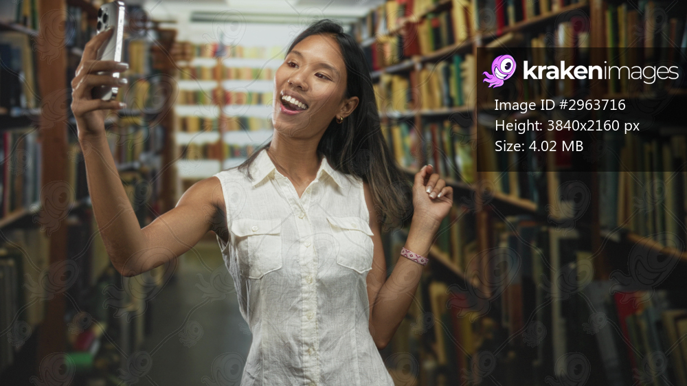Thai woman holding smartphone with raised hand and pointing finger among tall bookshelves in building aisle; playful engagement.