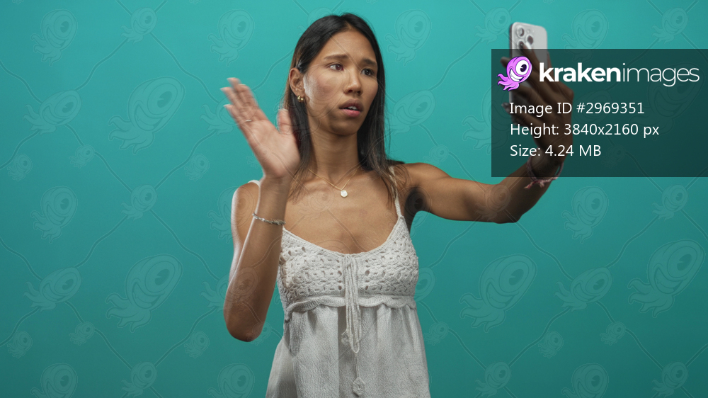 Thai woman holding smartphone and waving hand in studio with pouting expression and hand on chest, recording a sad selfie video; lonely sadness.