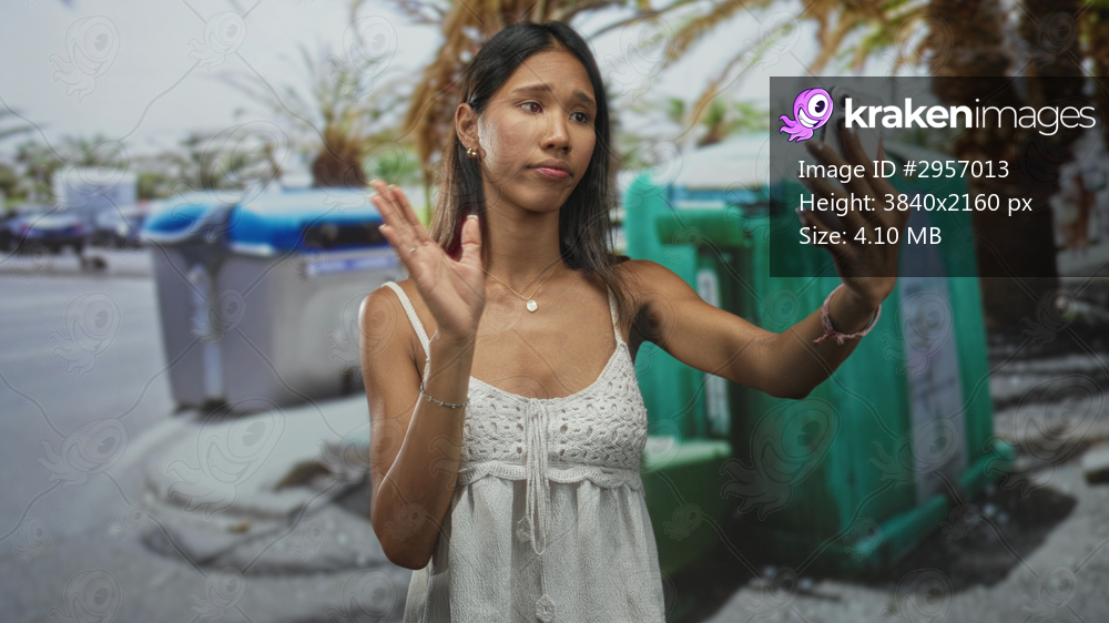 Thai woman holding smartphone waving hand on street near recycling bins; long distance call friendly.