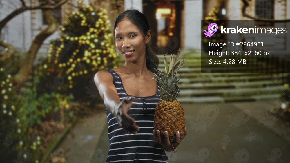 Thai woman holds a pineapple and extends her hand for a handshake at building steps; hospitality welcoming.