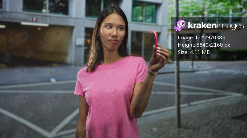 Thai woman holds a pink disposable razor up between fingers inspecting it while standing on a city street; self care contentment.