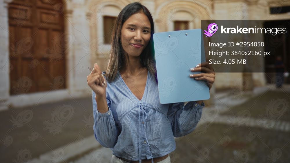 Thai woman holds blue clipboard and pen while pointing index finger to clipboard in front of building; confidence invitation.